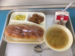 本日の給食は、豚肉のデミグラスソース、キャベツとコーンのソテー、スープでした。