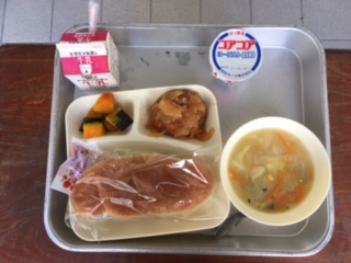 本日の給食は、煮込みハンバーグ コーンスープ 焼きカボチャ ヨーグルト パン 牛乳 でした。ごちそうさまでした。