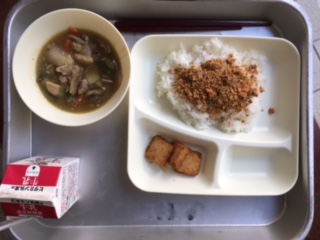 本日の給食は、鶏肉とじゃがいもの煮物 あつあげのしょうゆだれかけ 紅鮭そぼろ でした。