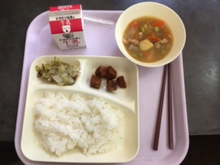 本日の給食は、まぐろのオーロラ煮、含め煮、キャベツの赤じそあえ でした。
