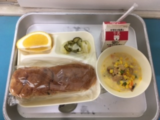 本日の給食は、コーンクリームシチュー キャベツときゅうりのサラダ かわりばんかん とぶどうパン 牛乳 でした。
