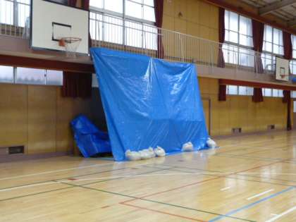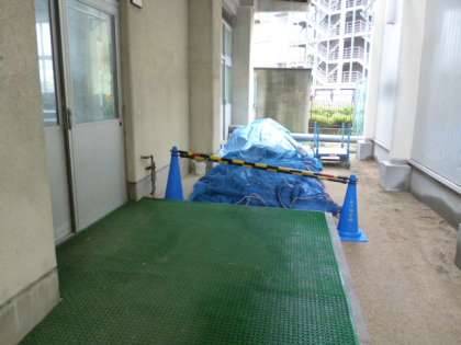 体育館の内部は、部分的に囲って室内機の設置工事が行われます。外部は、室外機の設置工事が体育館入口の前付近で行われます。また、資材が置かれている場所もあります。安全のため、工事の部分に立ち入らないようにお願いします。