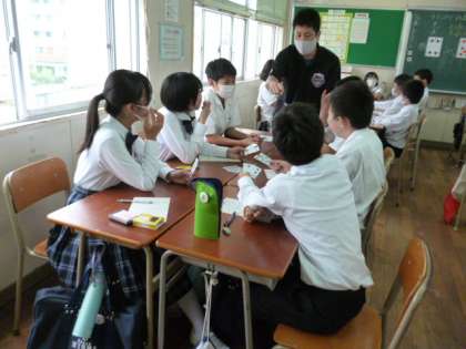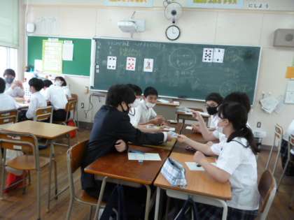 1−3では、数学の時間です。班になって、トランプを配り、楽しく「トランプで計算」をしました。