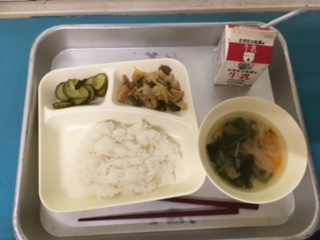 本日の給食は、ホイコウロー きゅうりのピリ辛あえ とりにくとこまつなとにんじんとたまねぎとえのきの中華スープ でした