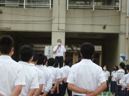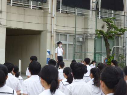 本日から、通常授業がおこなわれるので、生徒たちは元気よく登校してきました。天気も良く、運動場で全校集会が行われました。生徒会役員の進行で、8時25分には、整列することができました。挨拶の後、校長先生からのお話です。「いじめのついて考えよう」について、大事な言葉をわかりやすく示してお話してくださいました。