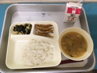 本日の給食は きびなごのてんぷら 豚汁 わかたけ煮 でした。