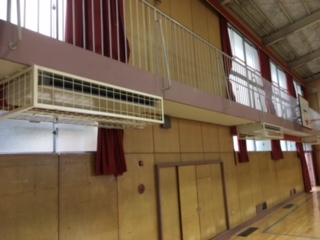 また、体育館の空調工事も進み、左右に4台づつのエアコンも設置されました。まだ工事は続いており動かせるのはもう少し先のことですが、体育館での熱中症の防止に役立つことを期待しています。
