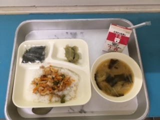 本日の給食は、かやくごはん わかめとキャベツと豆腐ともやしのみそ汁 まっ茶ういろう でした。