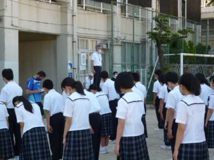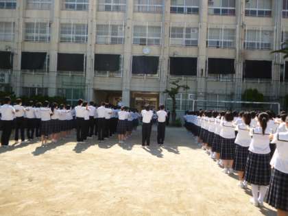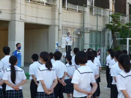 さわやかな快晴の空のもと、全校集会が運動場で行われました。