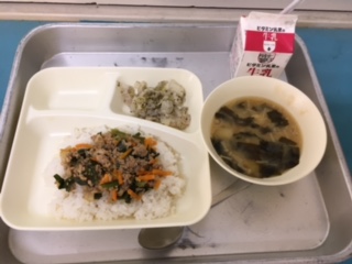 本日の給食は、豚ひき肉とにらのそぼろ丼 みそ汁 キャベツの赤じそあえ でした。
