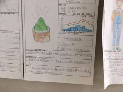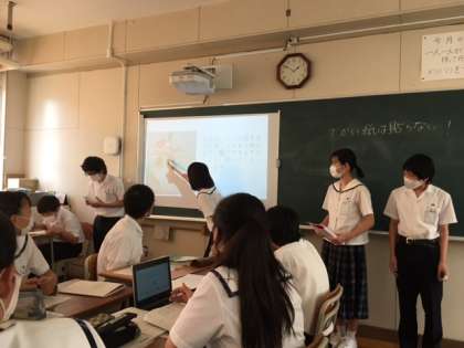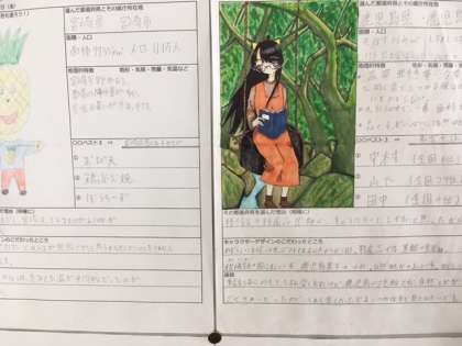 2年生の授業も本格的に進み、徐々に学習内容もレベルアップしてきています。単に教科書にあることを覚えるだけでなく、自分で調べて内容を深めていくような学習が始まっています。社会では九州の各県を「擬人」化し、自分の調べたことを「人」のイメージとともに整理し、全員が作品に仕上げました。九州の各県の特徴について、お互いの受け止め方の違いに驚いたり感心したりしながら、理解を深めています。生徒の作品は教室前の廊下に展示してあります。11日の進路懇談会でお越しの際にご覧ください。