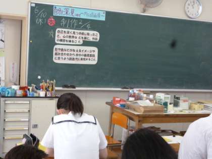 「自分を深く見つめて」内なる自画像を表現します。下書きを終えて、色を重ねている人もいますね。