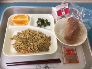 本日の給食は、和風やきそば オクラの甘酢あえ オレンジ でした。