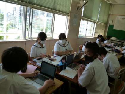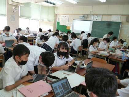 5時限目 1-1は、国語の授業です。「調べたことを整理して、わかりやすくまとめる」の単元で、学習用端末を使って、グループワークをしています。