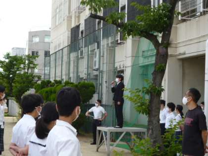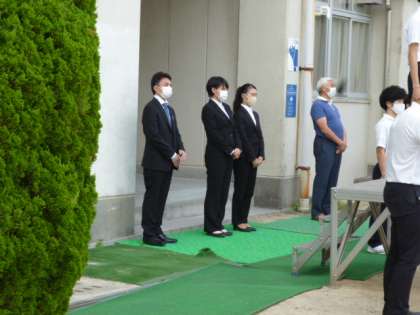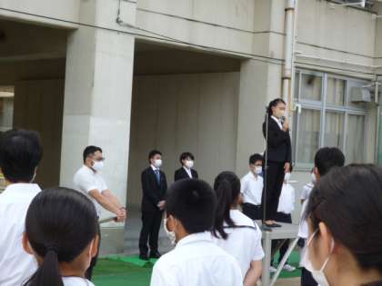 さわやかに晴れた朝の全校集会が始まりました。今日は、3週間教育実習をされた先生方から、最後の挨拶がありました。一人ひとりが、様々な活動で学んだお礼と感じたこと、みんなに伝えたいことをお話されました。3週間楽しい思い出をありがとうございました。