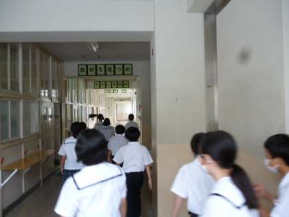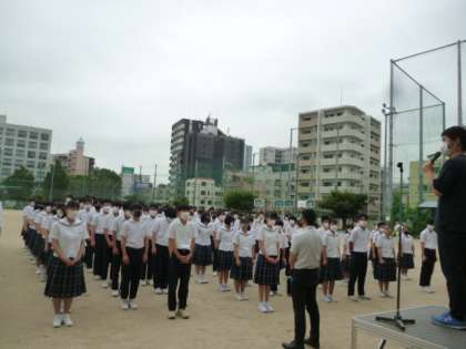 「大規模な地震の発生」として、避難の放送があり、各クラスで素早く移動。運動場へ集合しました。そして、「津波のおそれ」があるとして、3階以上へ上がる練習をしました。