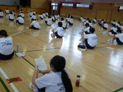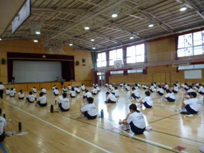 体育館に集合、整列し、間隔を置いて座りました。期末テストの返却、説明がありました。