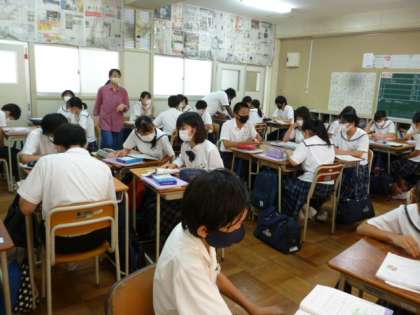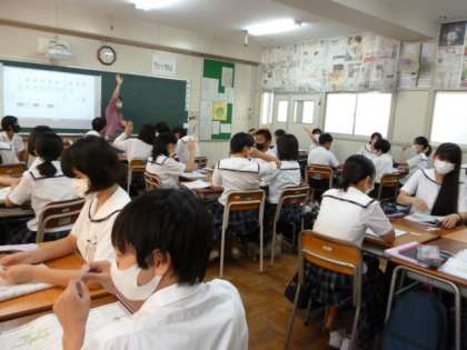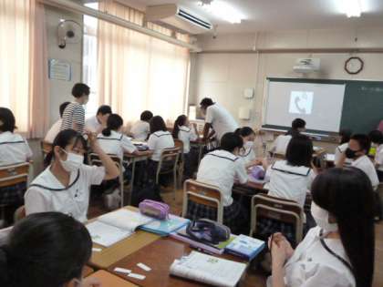 今日は、机をつけて、班で学習しています。「電話を掛ける」「電話を受ける」など、それぞれの役になって、会話の練習です。教科書を見ながら、頑張って会話に挑戦しています。