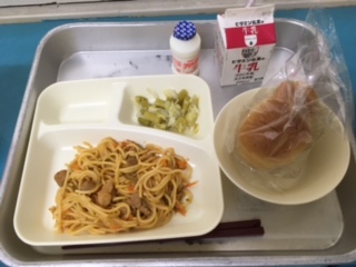 本日の給食は チキントマトスパゲッティ グリーンアスパラガスとキャベツのサラダ 発酵乳 とパンと牛乳 でした。