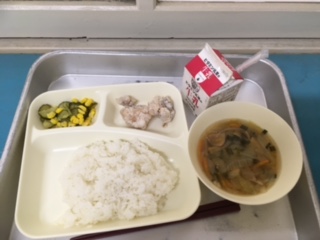 本日の給食は、鶏肉のからあげ 中華スープ きゅうりとコーンの甘酢あえ でした。