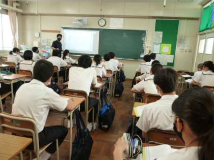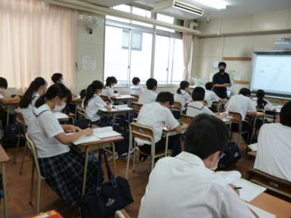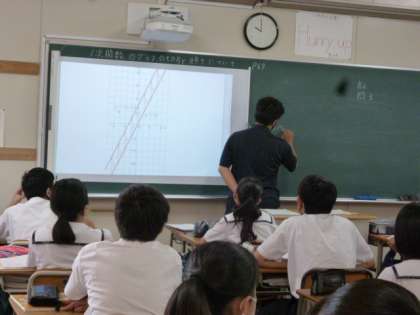 2時限目 2年3組の数学科の授業で、「学力向上推進事業」の研究授業が行われました。 数学科の 西山先生が授業を行いました。1次関数の単元に入っています。グラフの座標や切片などを確認しています。