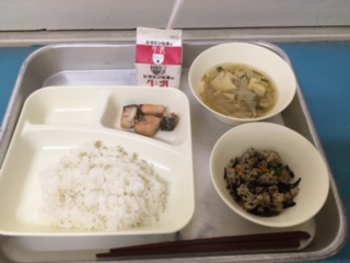 本日の給食は、さけのしょうゆ風味焼き 五目汁 高野どうふのいり煮 でした。