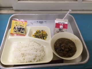 本日の給食は、マーボーなす ツナとチンゲンサイのいためもの いり黒豆 でした。