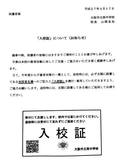 さて、今年度から不審者対策の一環として、来校時には玄関に設置してある来校者名簿のご記入とともに、新たに「入校証」を携行・着用していただくことにいたしました。