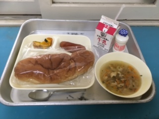 本日の給食は、フランクフルトのケチャップソース スープ 焼きカボチャ 発酵乳 でした。