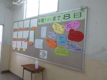 1年生の教室前の掲示板には「中間テストまで8日前」が貼られていました。