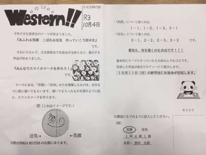 次に、生徒会から、文化発表会のテーマ『あふれる笑顔 こぼれる活気 作っていこう西中生』が発表され、「スマイルマーク」の募集が伝えられました。
