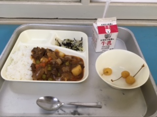 本日の給食は、ハヤシライス キャベツのひじきドレッシング サクランボ でした。