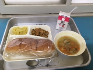 本日の給食は、豚肉と野菜のケチャップソテー スープ スイートポテト でした。