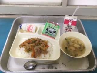 本日の給食は、ピリ辛丼 中華スープ ソフト黒豆 発酵乳でした。※明日は給食はありません。