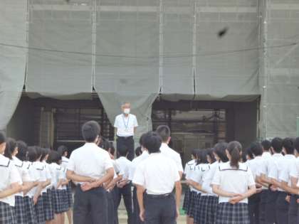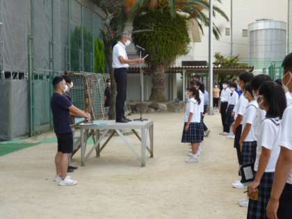 涼しく、良く晴れた朝となりました。今日は、運動場で全校集会が行われました。