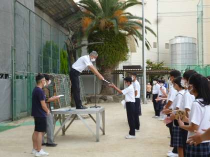 次に、後期の認証式が行われました。後期の生徒会役員に認証状が渡されました。また、全学年の代表として、3年1組の学級代表が認証状を渡されました。