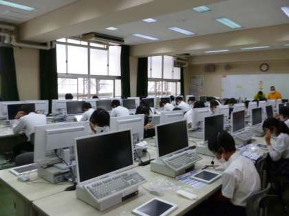 4技能(リスニング、リーディング、ライティング、スピーキングテスト)が教室、パソコン教室で行われました。専用タブレット、イヤホン、マイクなどの機器を使って、緊張した様子です。
