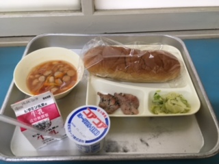 本日の給食は、鶏肉の香草焼き ウインナーとてぼ豆のスープ キャベツのガーリックソテー ヨーグルト でした。