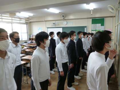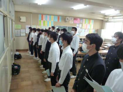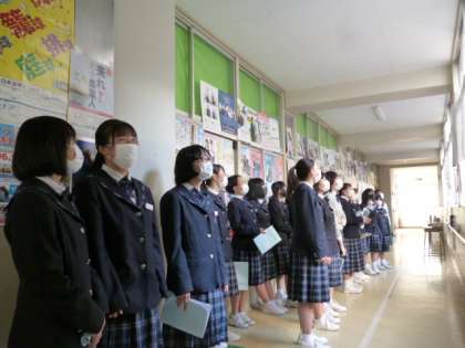廊下に、歌の歌詞を貼り、1.2組合同で廊下に向かって歌いました。活気ある歌声が、館内に響き渡りました。