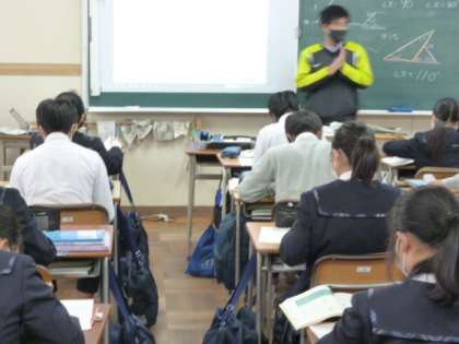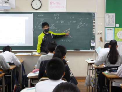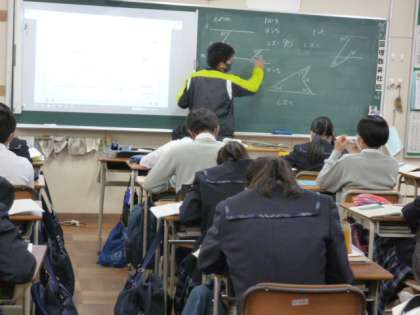 3時限目 2年3組の数学科の授業で、「学力向上推進事業」の研究授業が行われました。 数学科の 西山先生が授業を行いました。同位角、錯角、三角形の内和などを使って、角度を求めています。