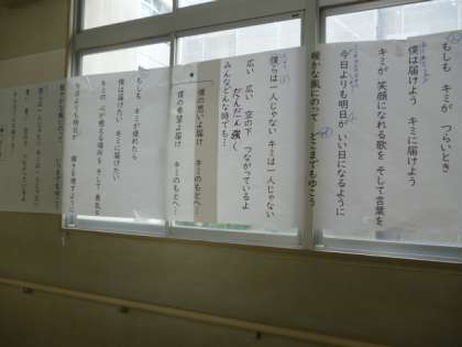 3年の教室前の廊下には、歌詞を貼ったり、合唱への「想い」が掲示されています。