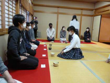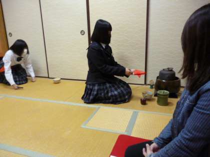 放課後、茶道部は、日頃の練習の発表として、和室に教職員を招いて「お茶のお点前」が披露されました。