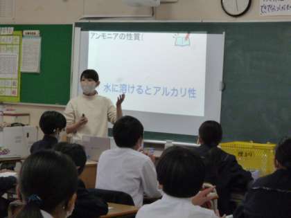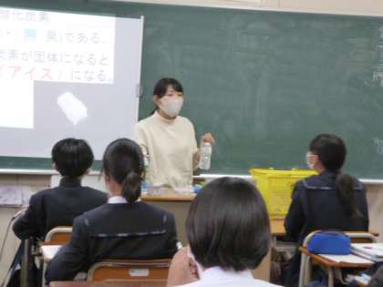 「気体の性質」の単元で、二酸化炭素と水をペットボトルに入れ、ボトルを振るとどうなるか?演示実験で説明しています。