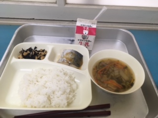 本日の給食は、さごしのおろしじょうゆかけ さといものすまし汁 大豆の煮もの でした。