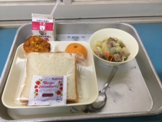 本日の給食は、豚肉と野菜のスープ煮 変わりピザ みかん 食パンとジャム でした。