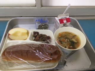 本日の給食は、牛肉のオイスターソース焼き 中華スープ りんご ミニフィッシュ でした。