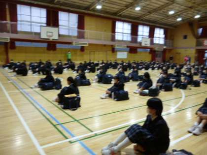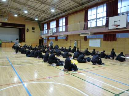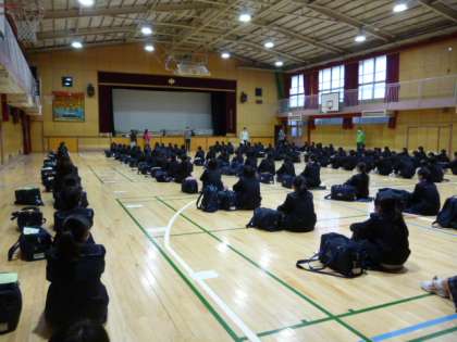1年一泊移住の前日となりました。5時限目、1年生は、体育館で一泊移住に向けての事前指導を行いました。