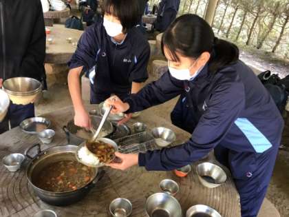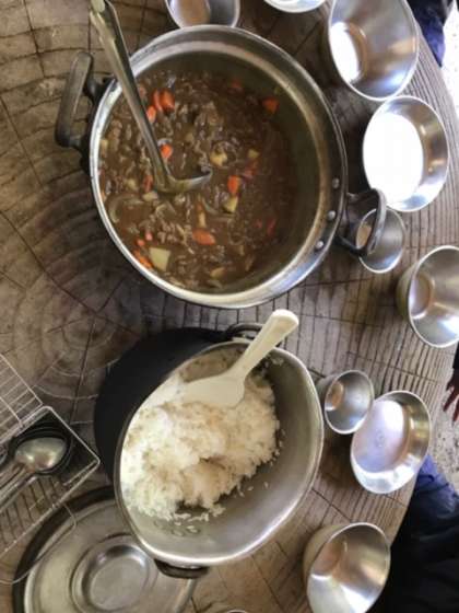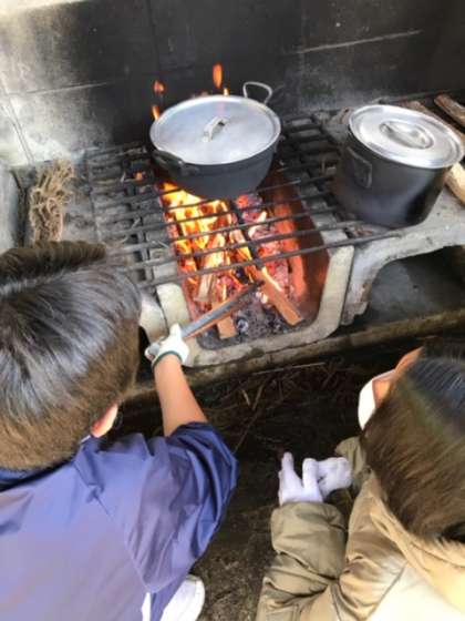 かまどに火をおこし、カレーを煮たり、飯盒炊飯に取り組んでいます。