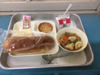 本日の給食は、とうふハンバーグ カリフラワーのスープ煮 スライスチーズでした。