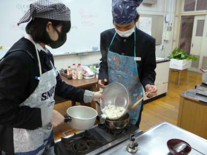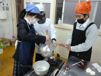 1限目、1−2家庭科の授業では、調理室で、「豚バラ肉と大根の煮物」を作りました。食材を切ったり、煮込んだり、平行して、洗い物の指導も行われていました。